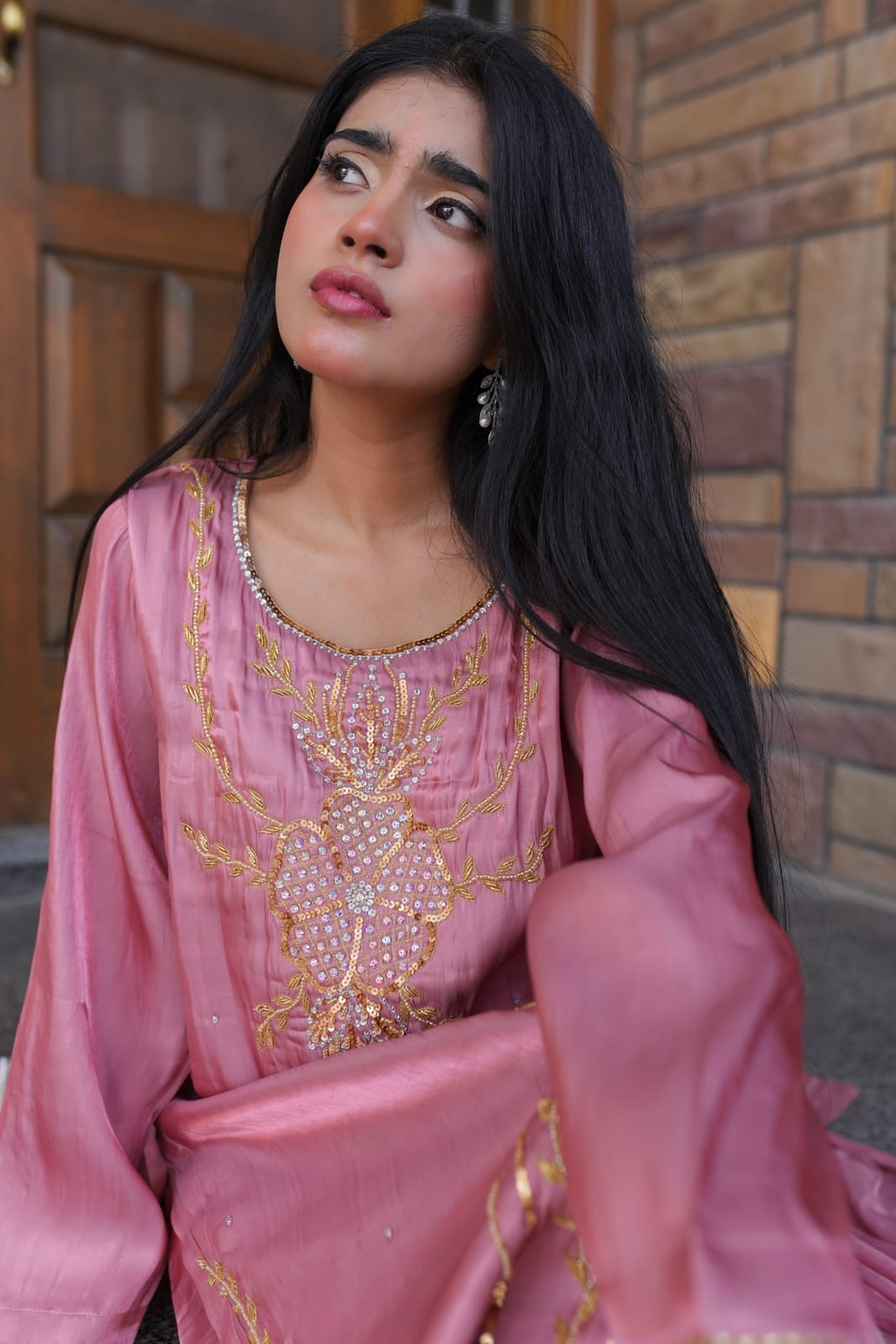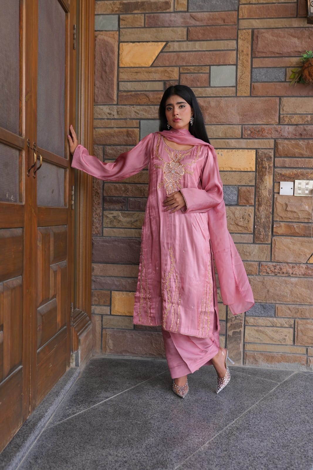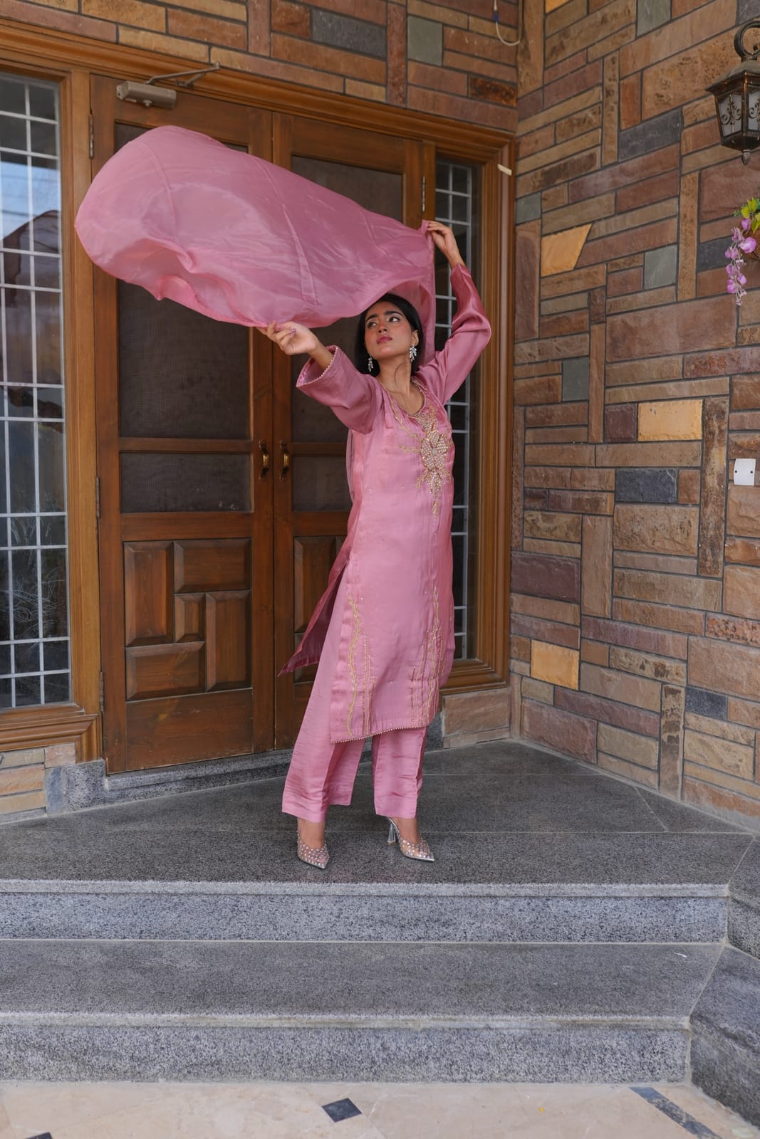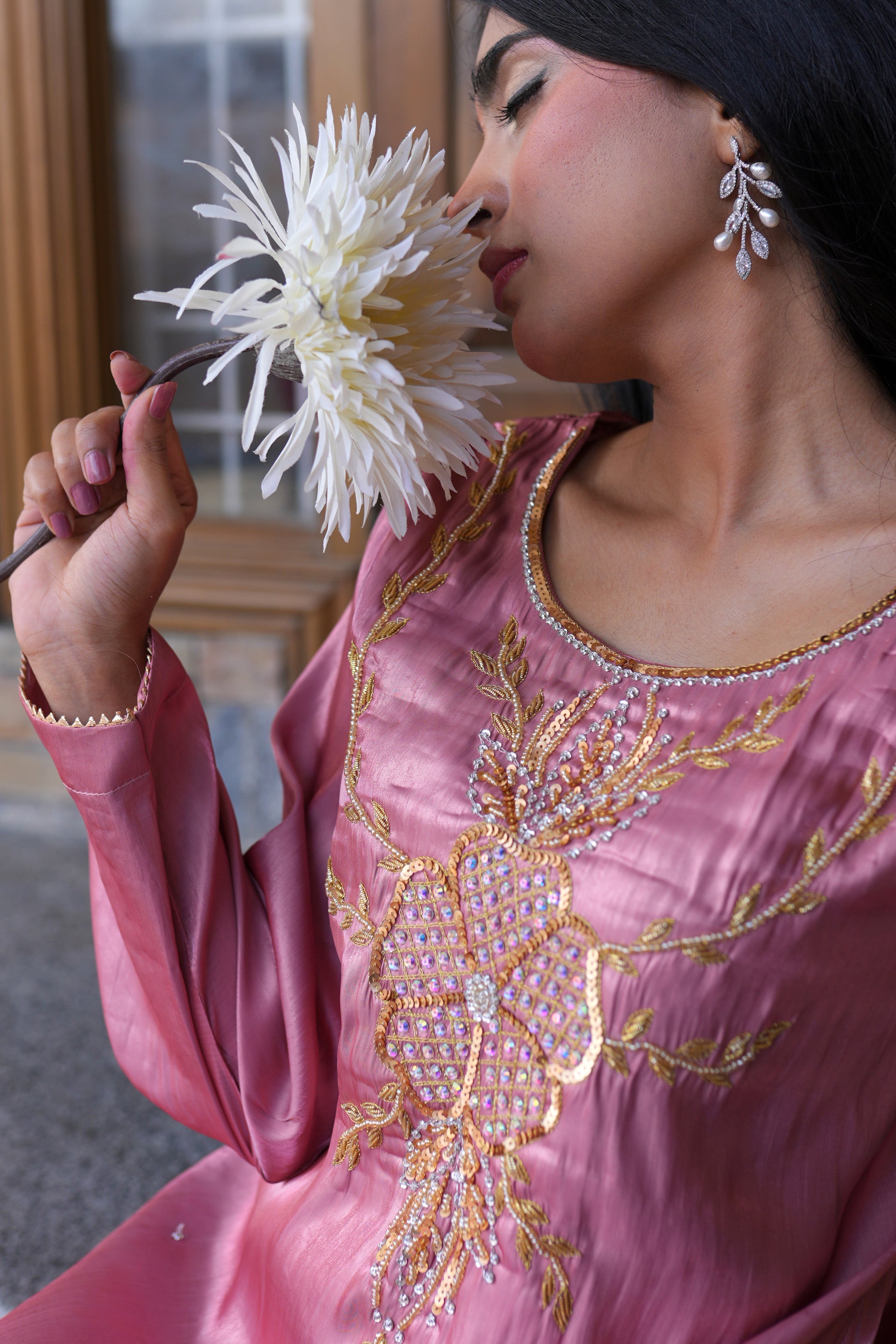 Stylish 3PC dress in rose gold color, fabrics silk featuring elegant embellishment on neckline and sleeves, paired with matching silk dupatta for a refined and graceful appearance.