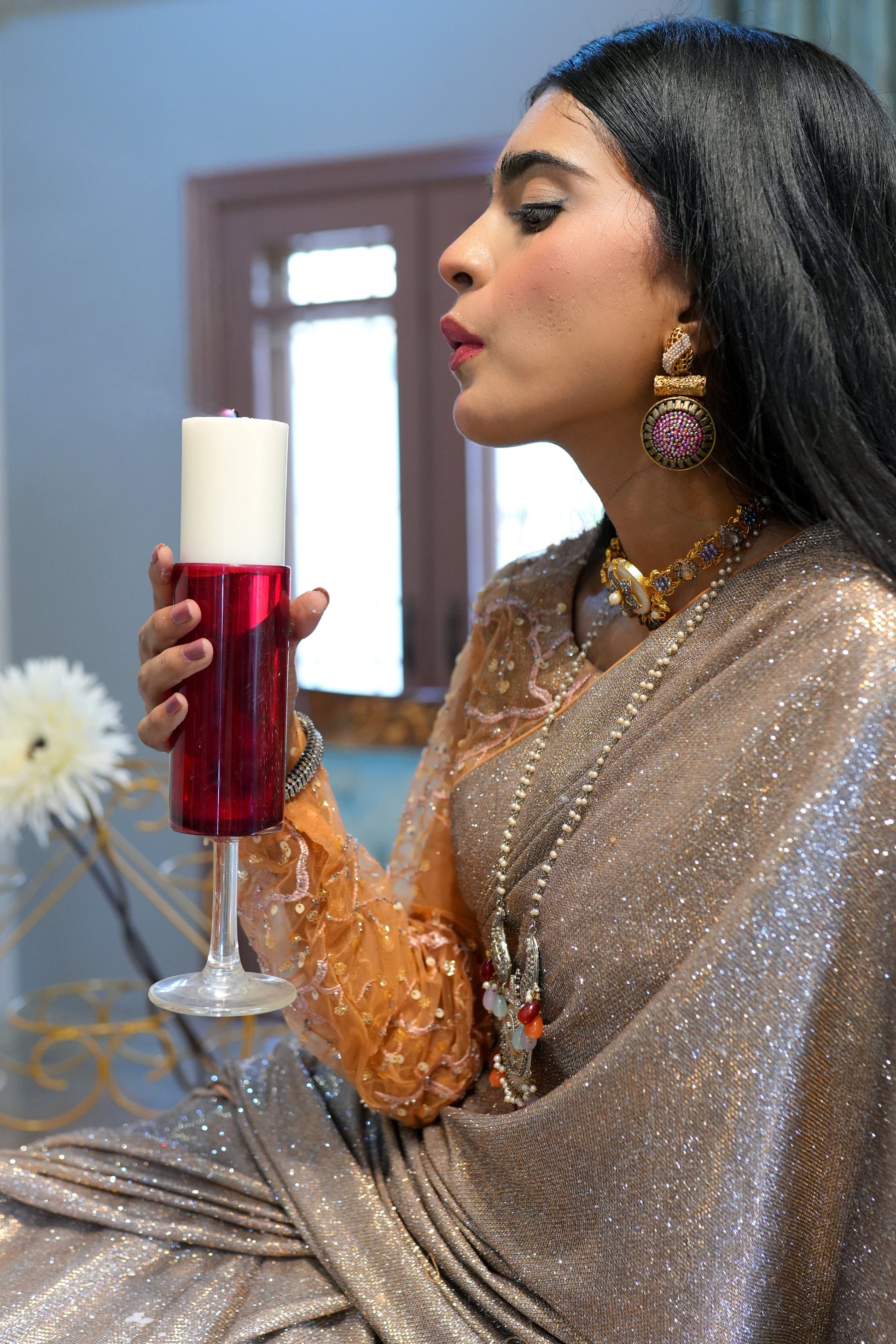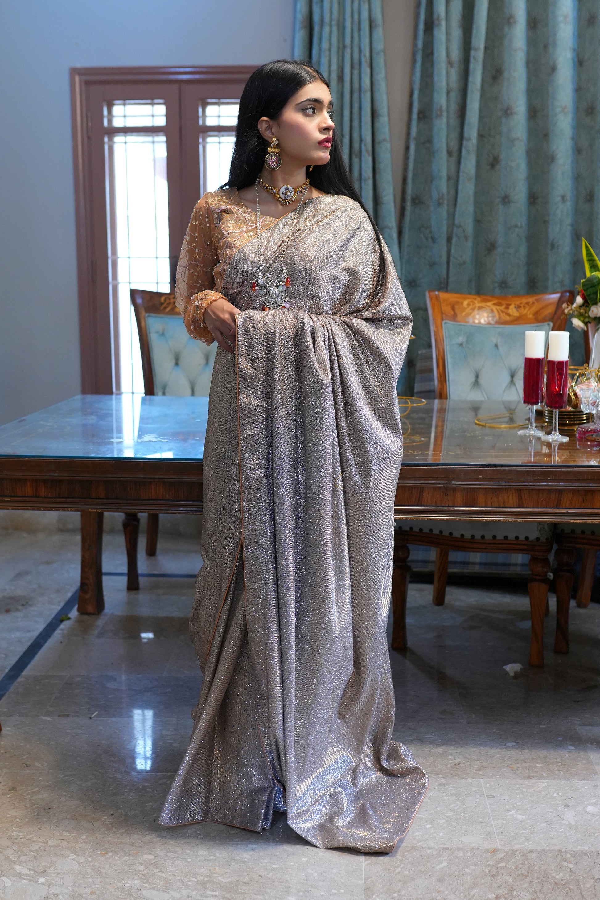 Stunning peach gold saree featuring heavy embellishment on the blouse, creating a luxurious and elegant look perfect for festive and special occasions.