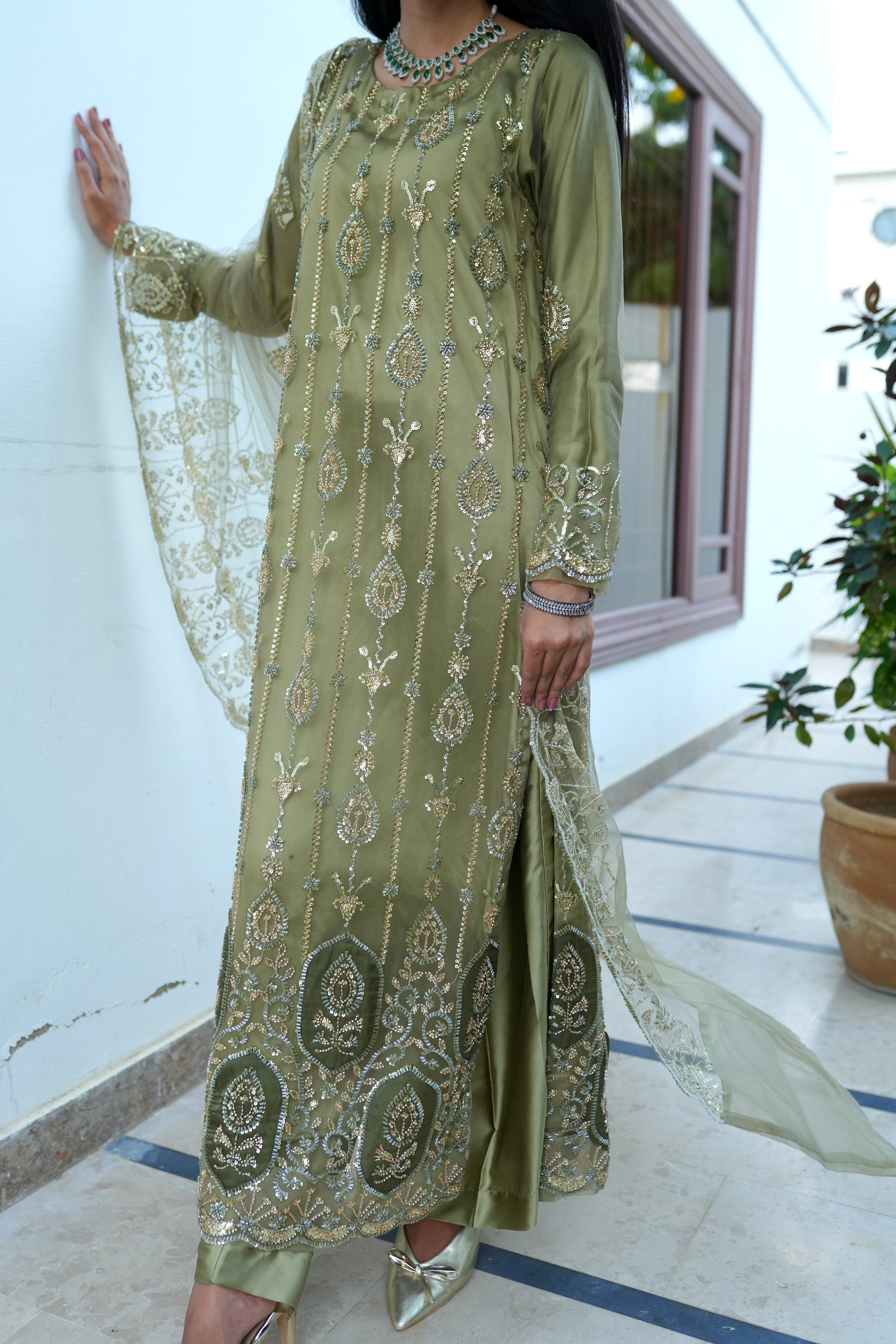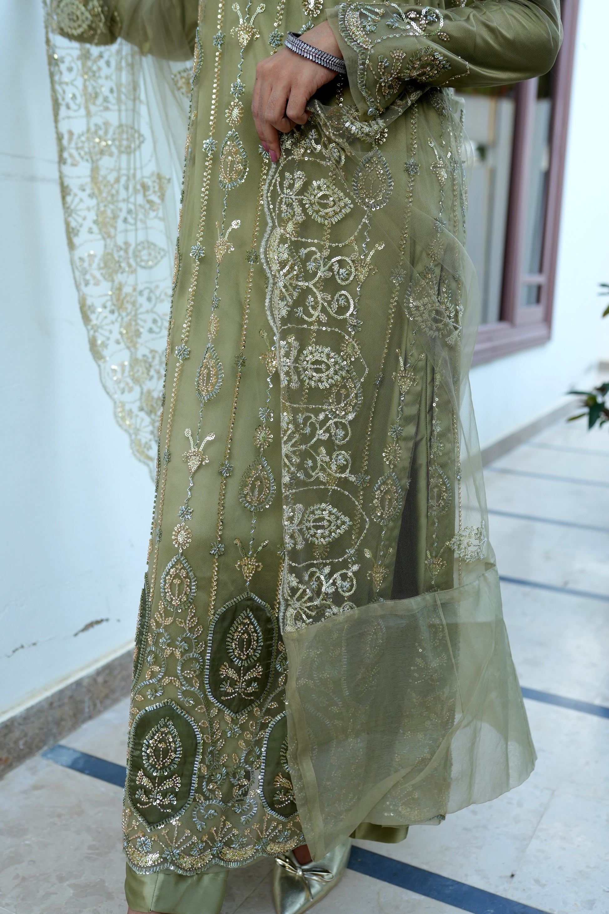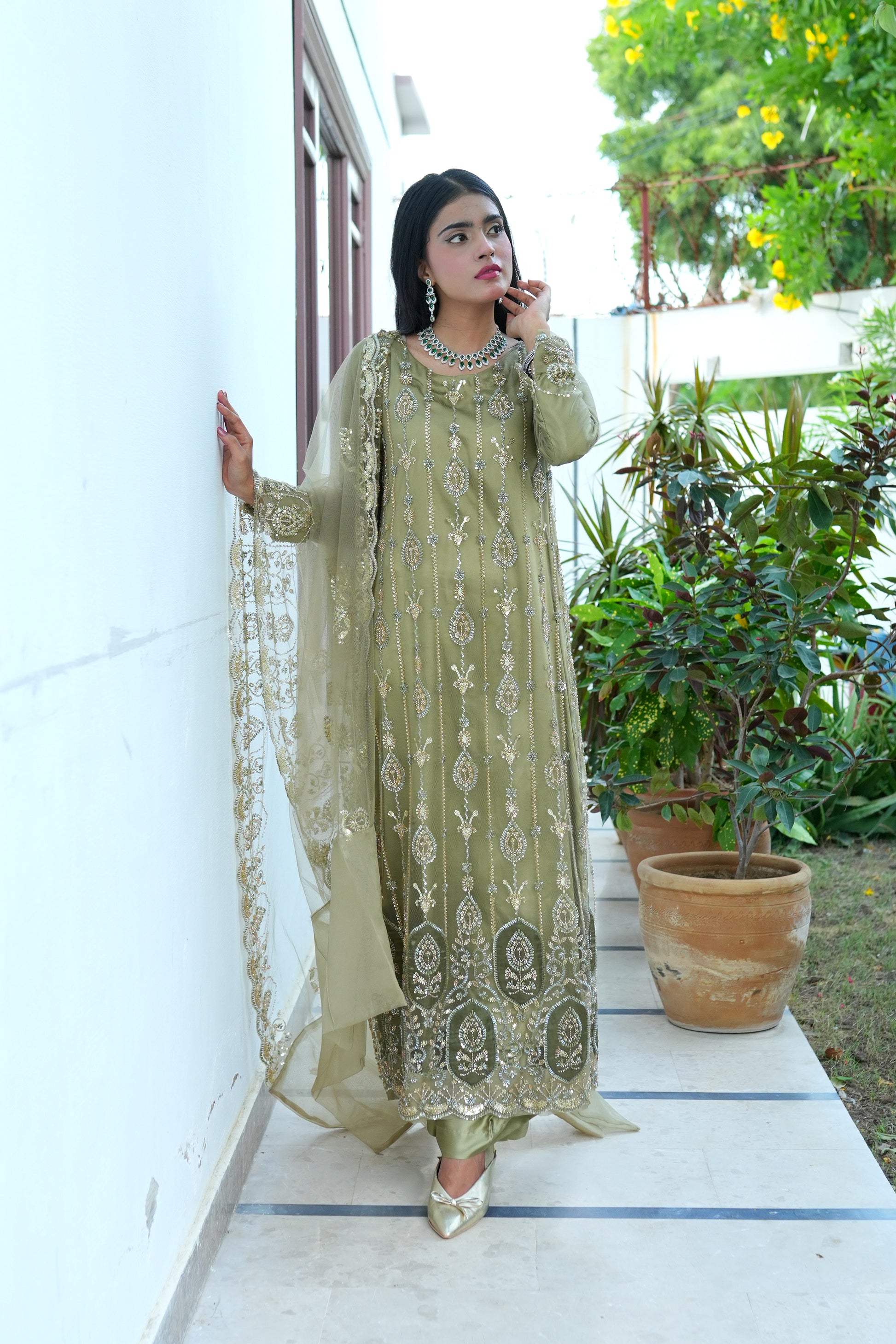 Gorgeous olive green net 3 PC dress adorned with elegant Moti, Cut Dana, and applique work, creating a luxurious and graceful look perfect for festive occasions.