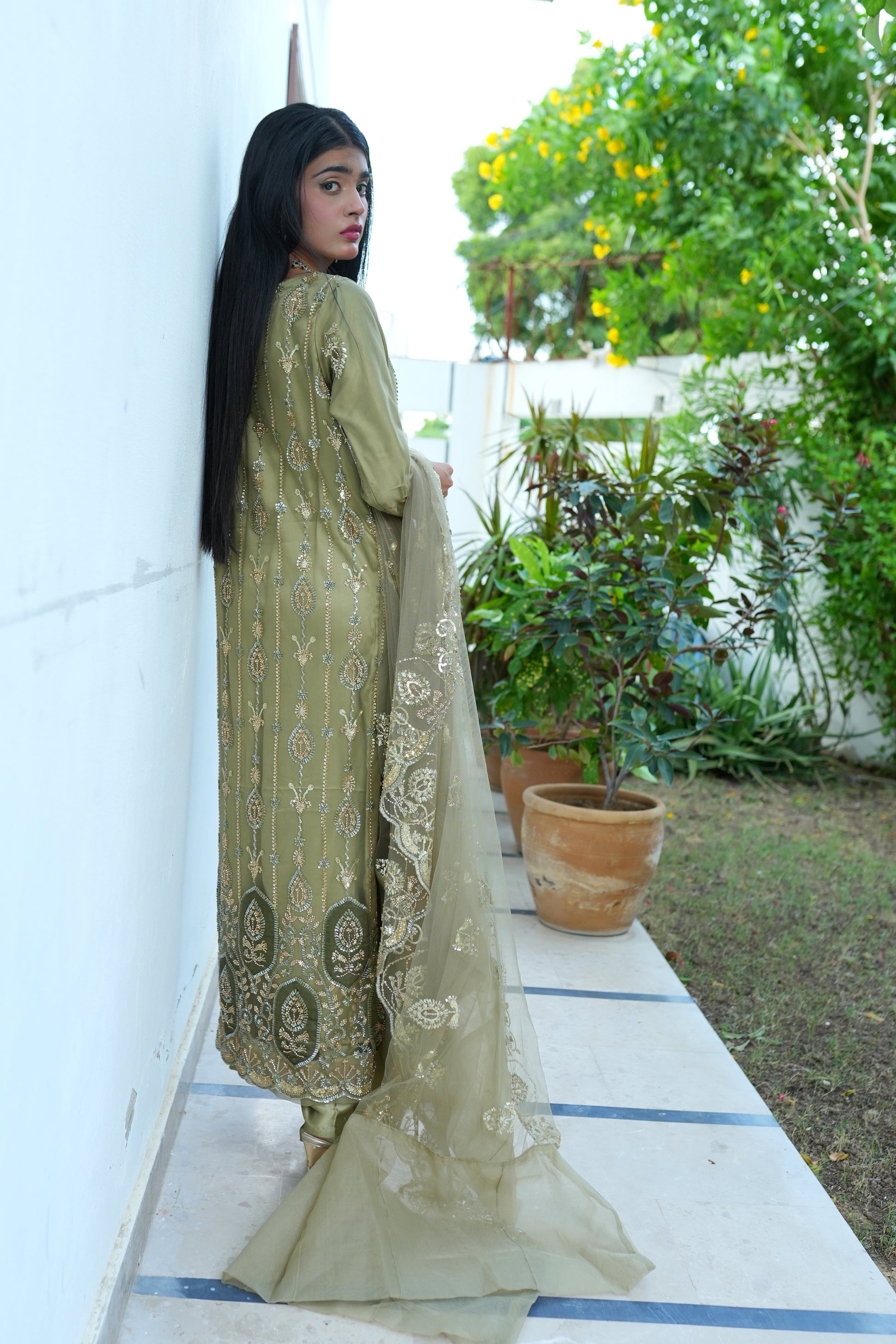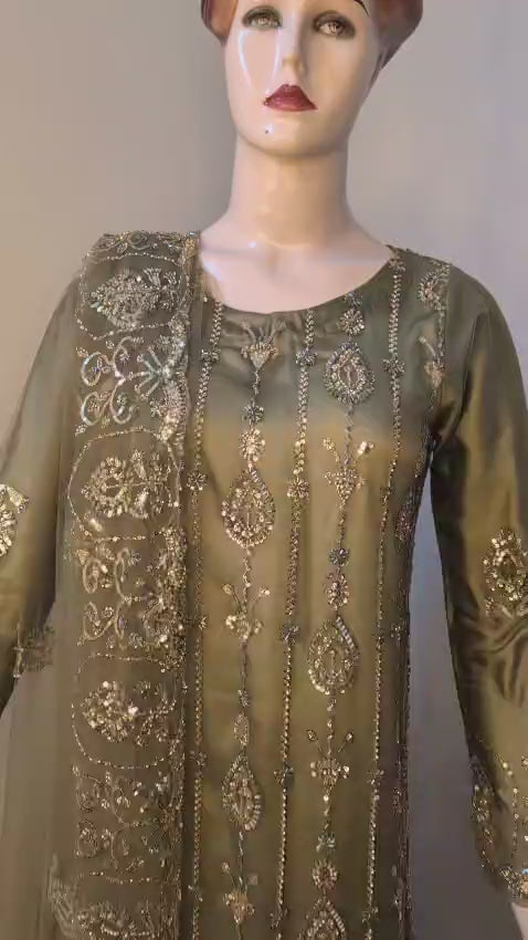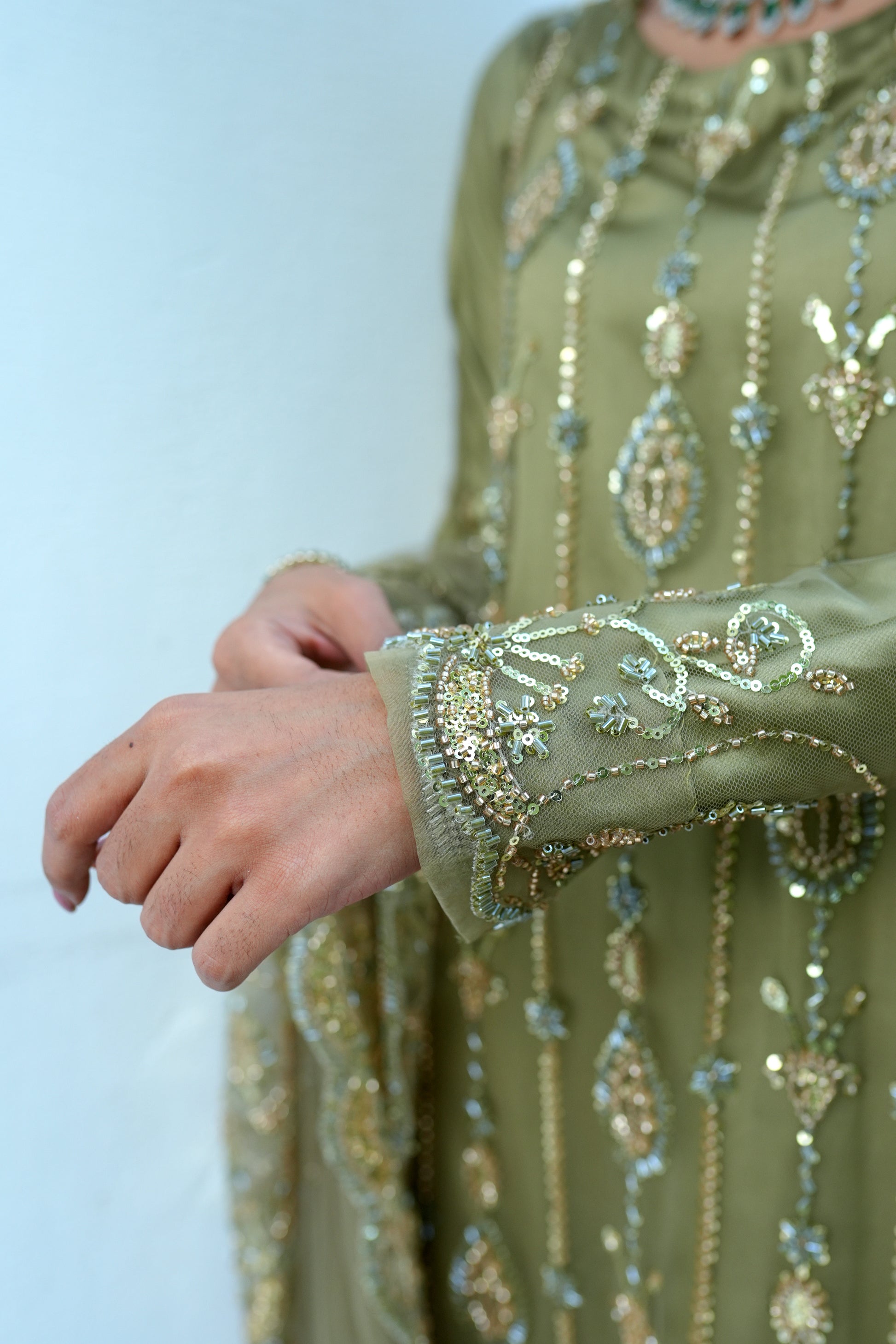 Gorgeous olive green net 3 PC dress adorned with elegant Moti, Cut Dana, and applique work, creating a luxurious and graceful look perfect for festive occasions.
