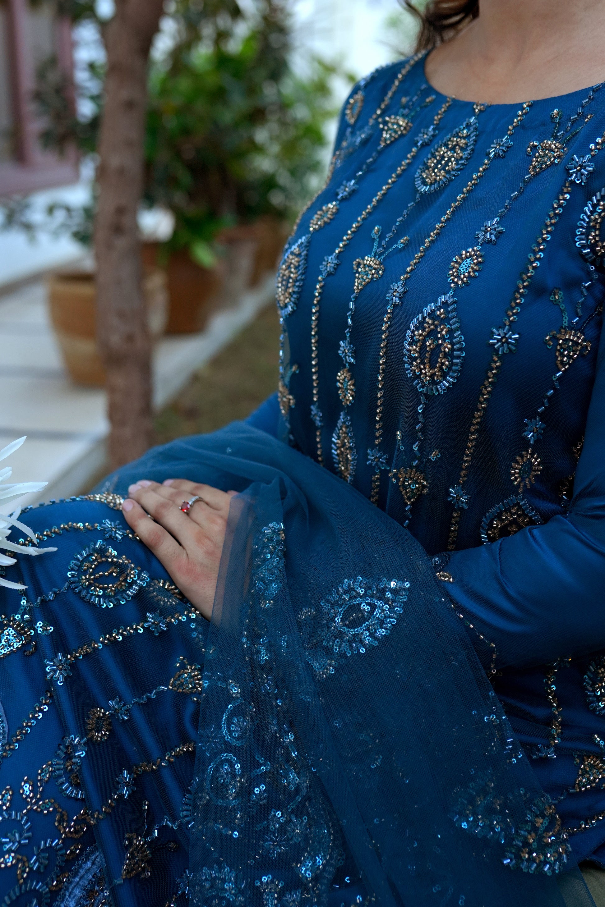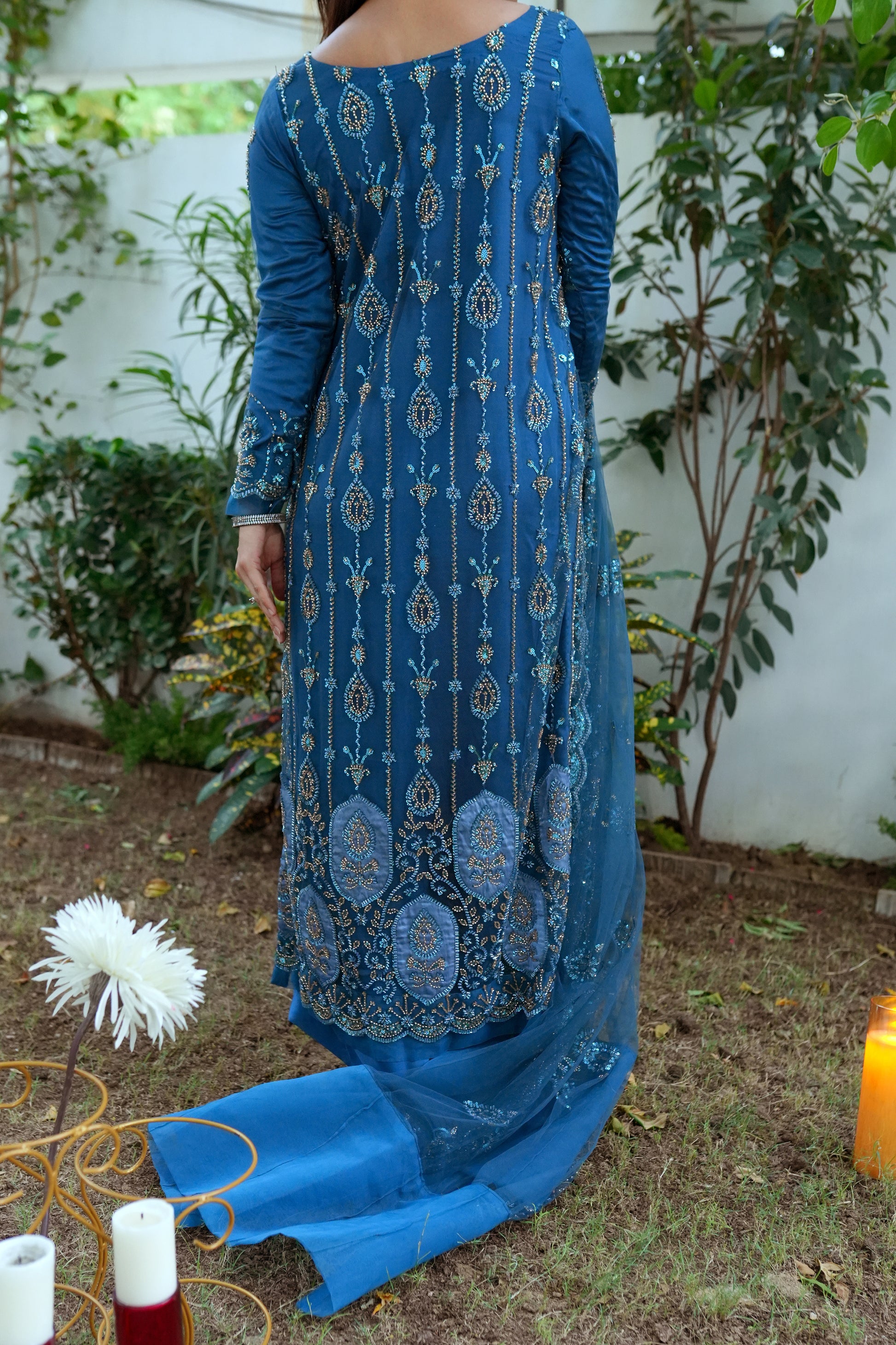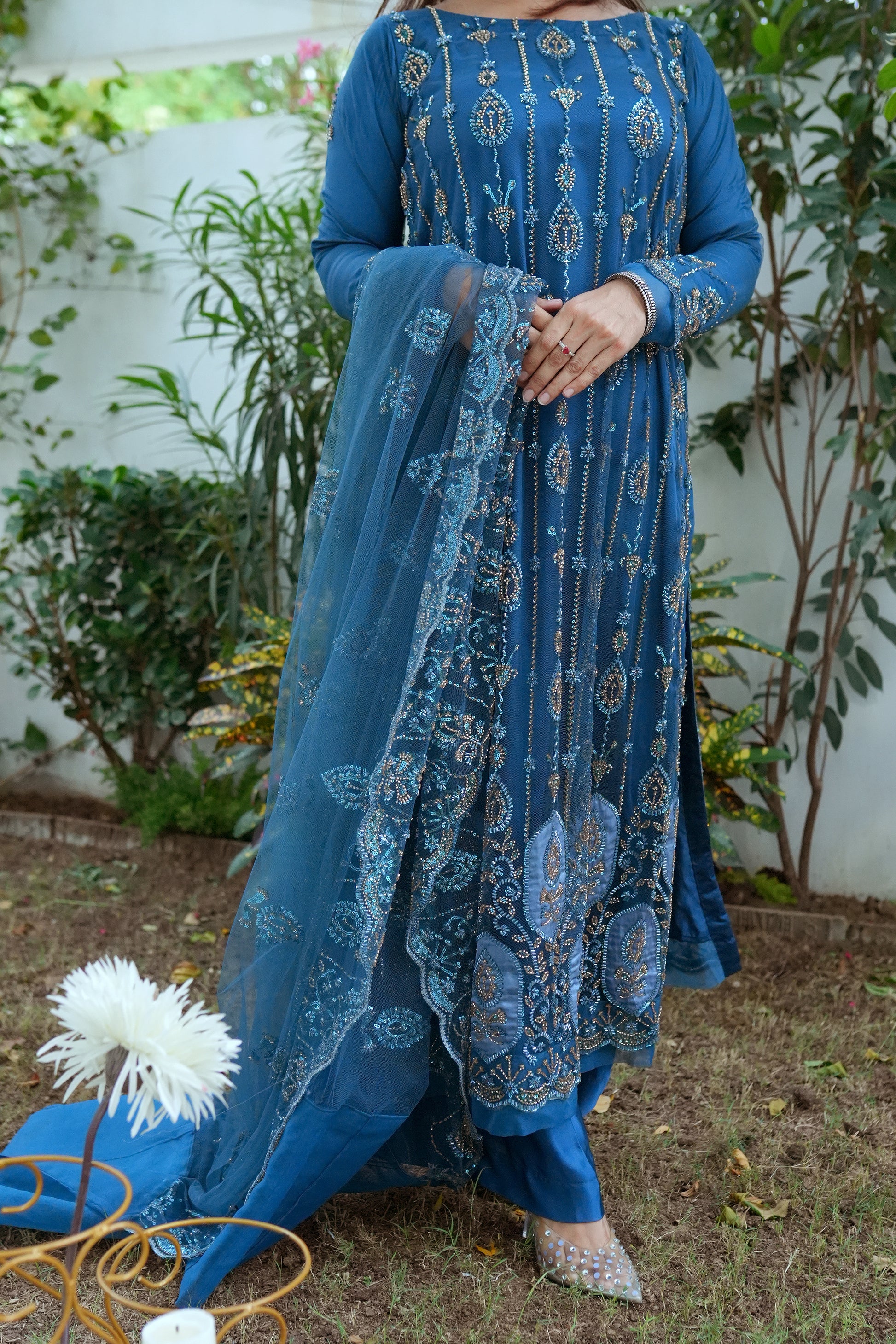 Wangaar present,Gorgeous blue net 3 PC dress adorned with elegant Moti, Cut Dana, and applique work, creating a luxurious and graceful look perfect for festive occasions.