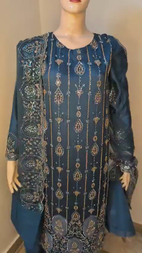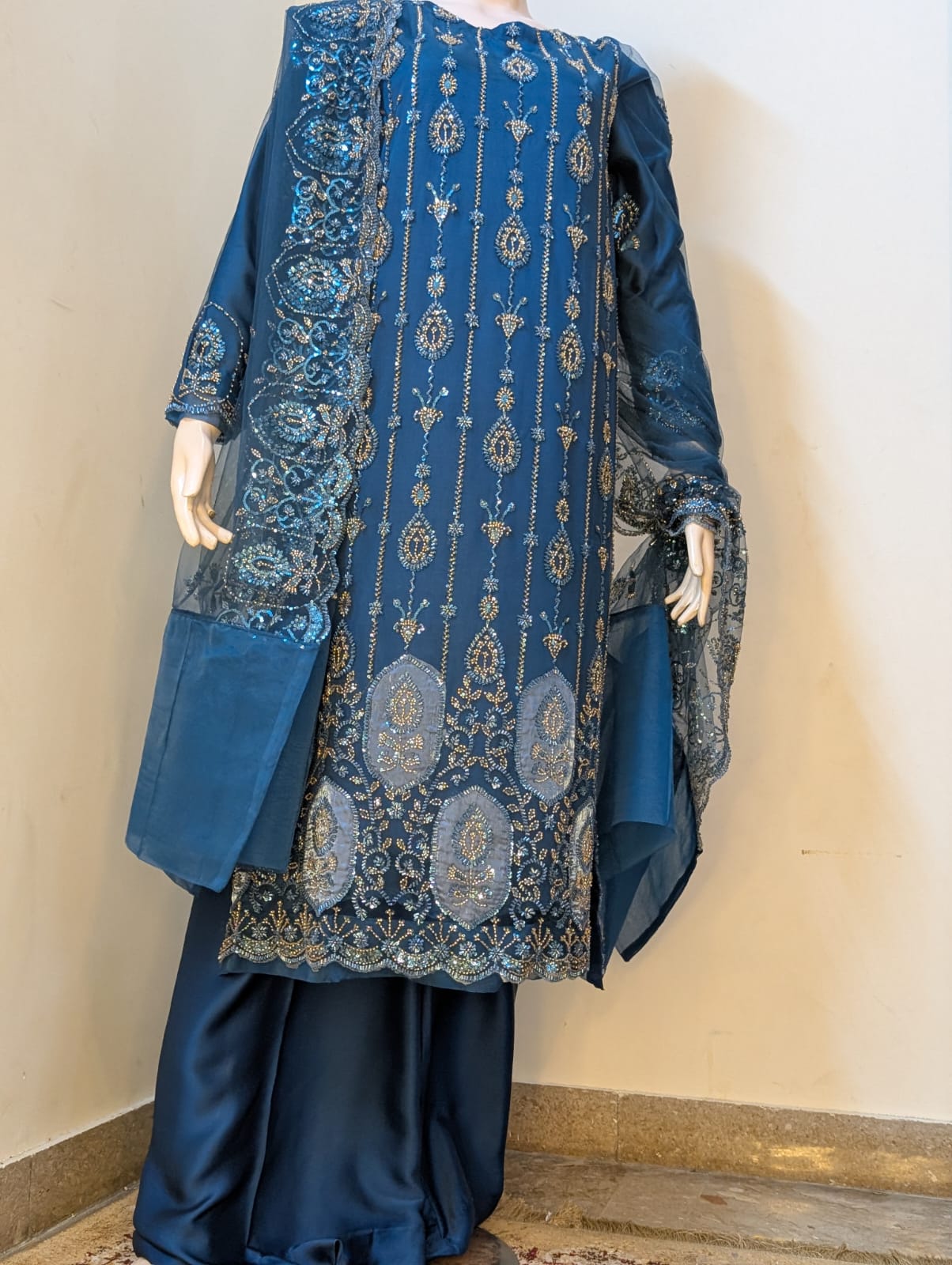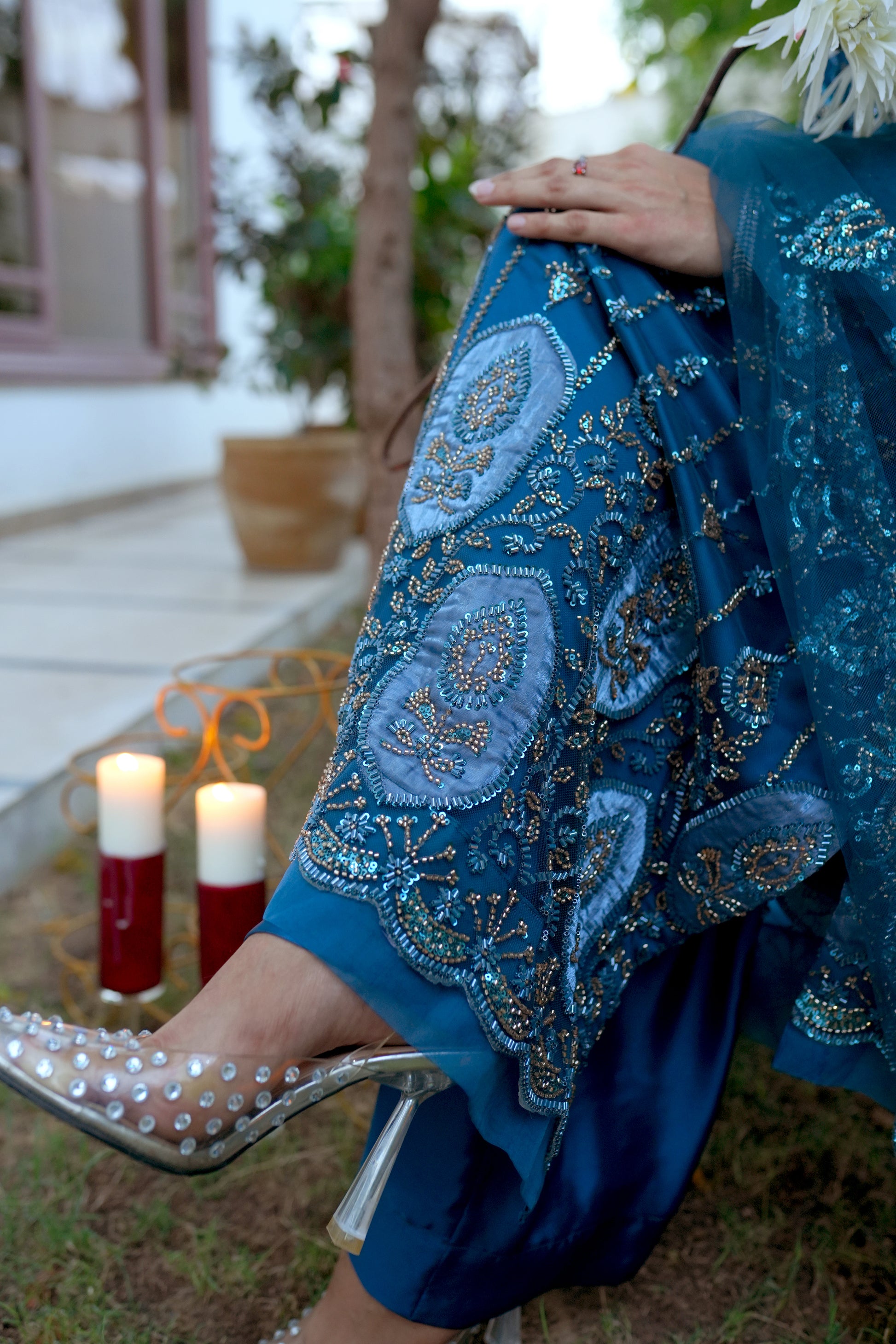 Wangaar present,Gorgeous blue net 3 PC dress adorned with elegant Moti, Cut Dana, and applique work, creating a luxurious and graceful look perfect for festive occasions.