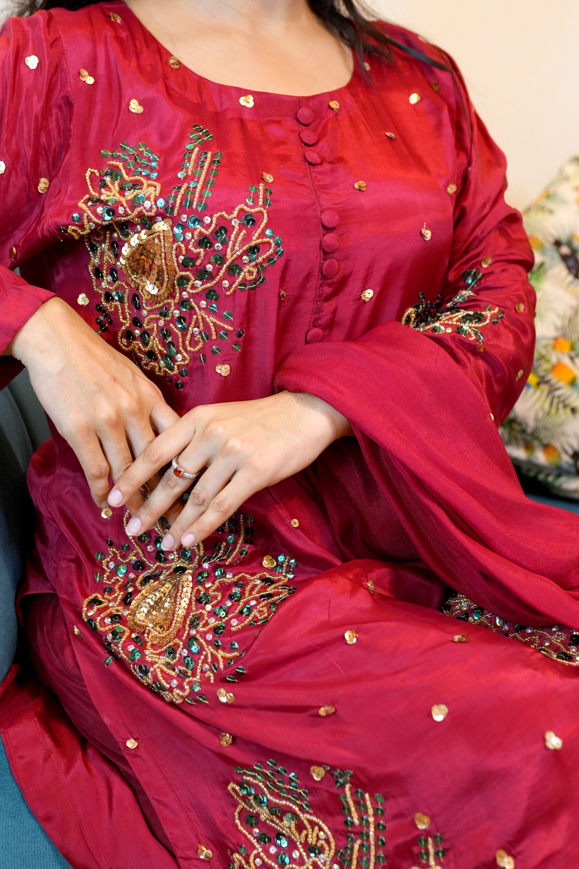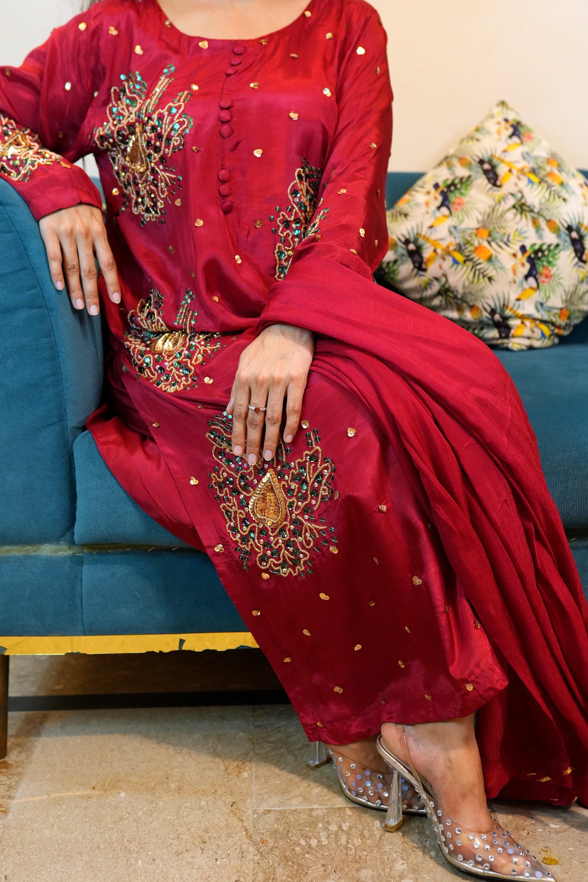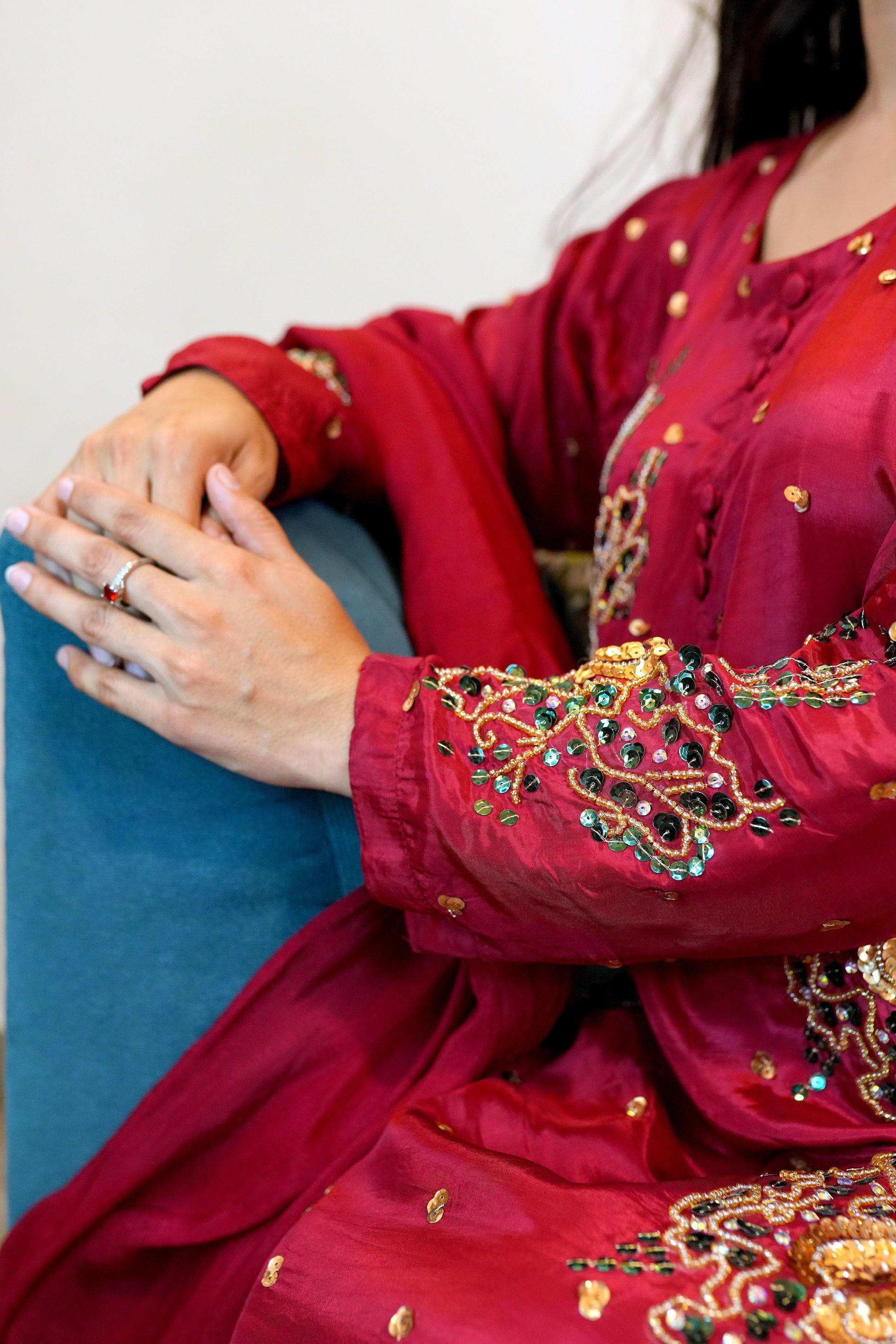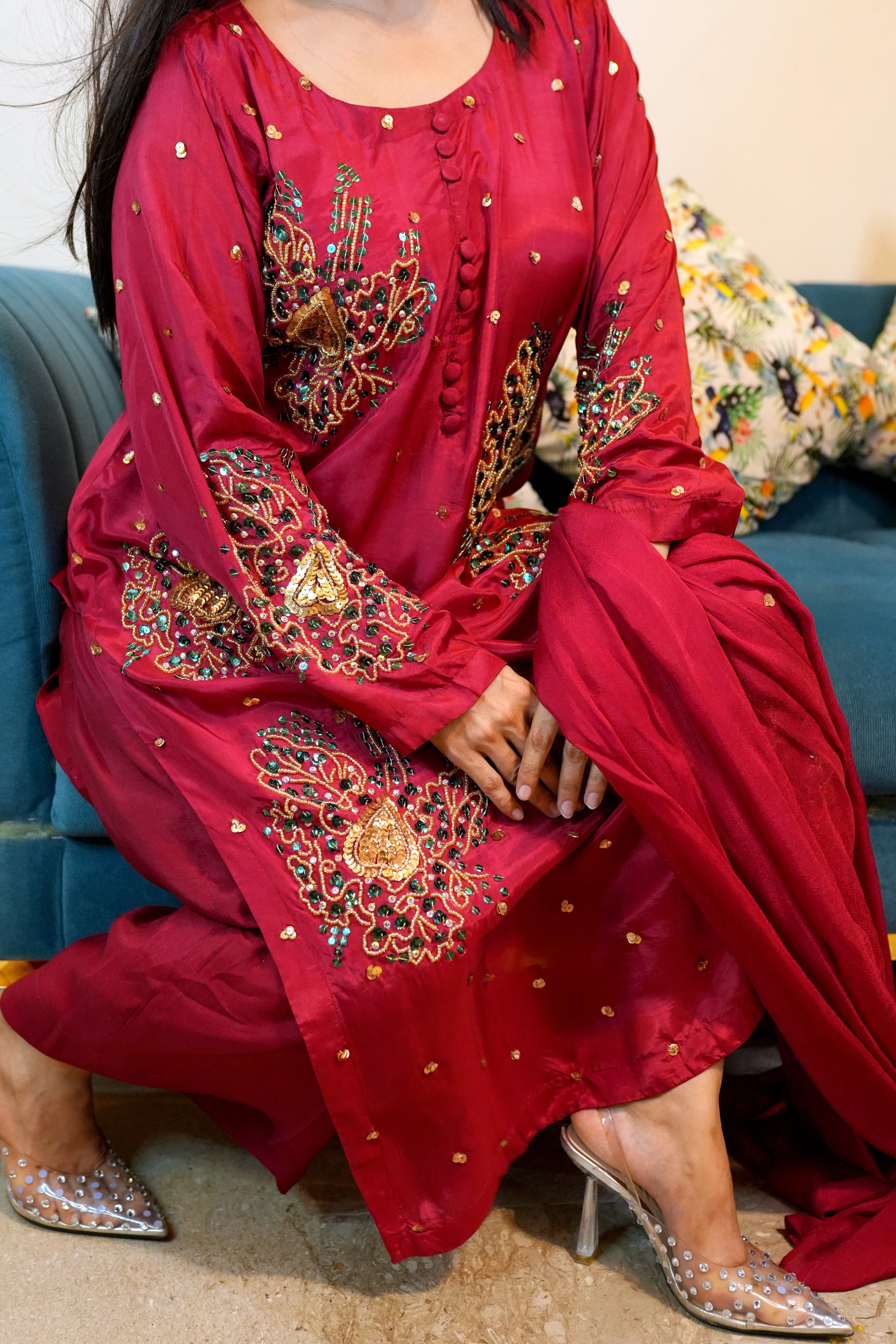 Stunning red raw silk 3 PC dress featuring heavy Sitara and Moti handwork, paired with a soft chiffon dupatta for an elegant and festive appearance.