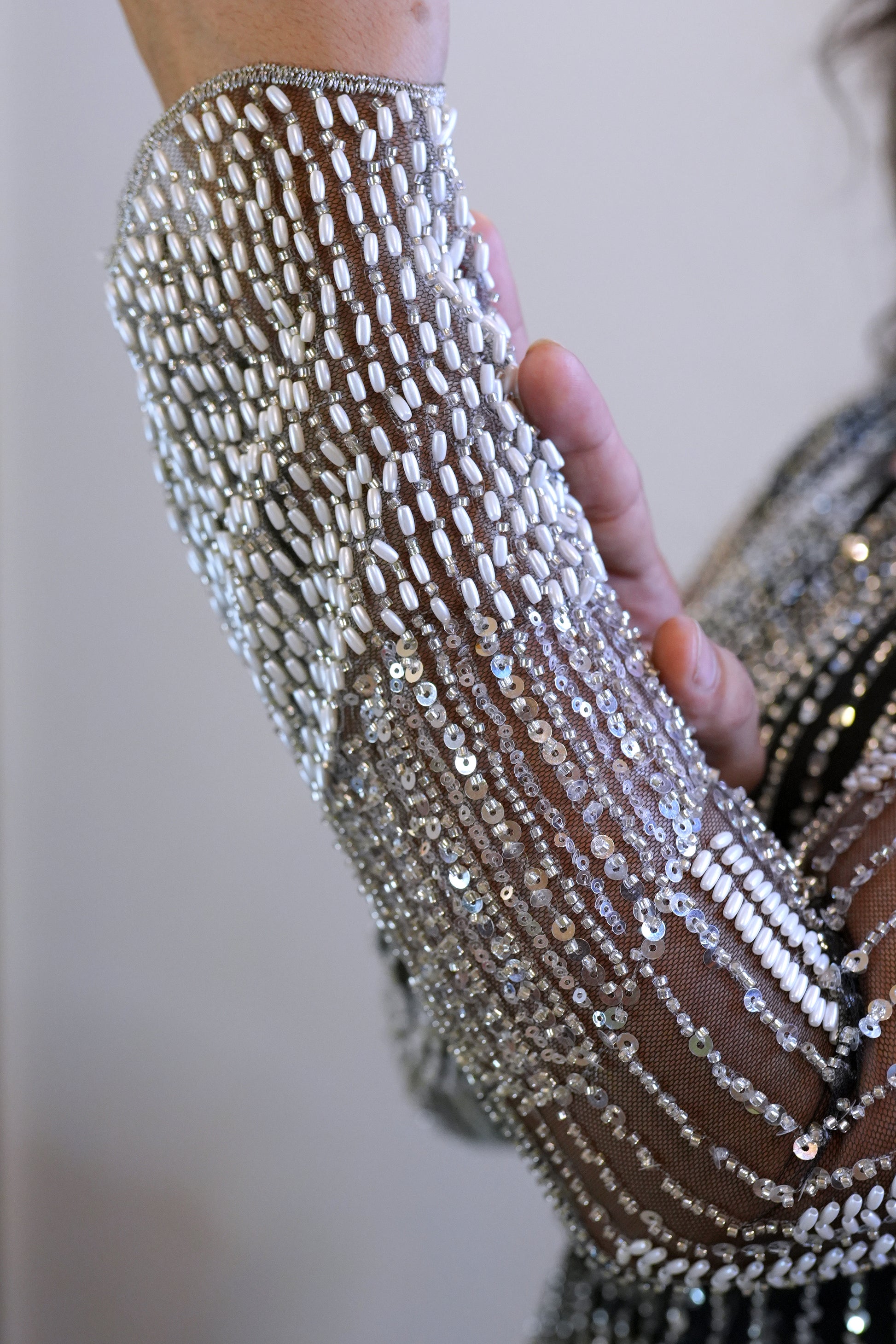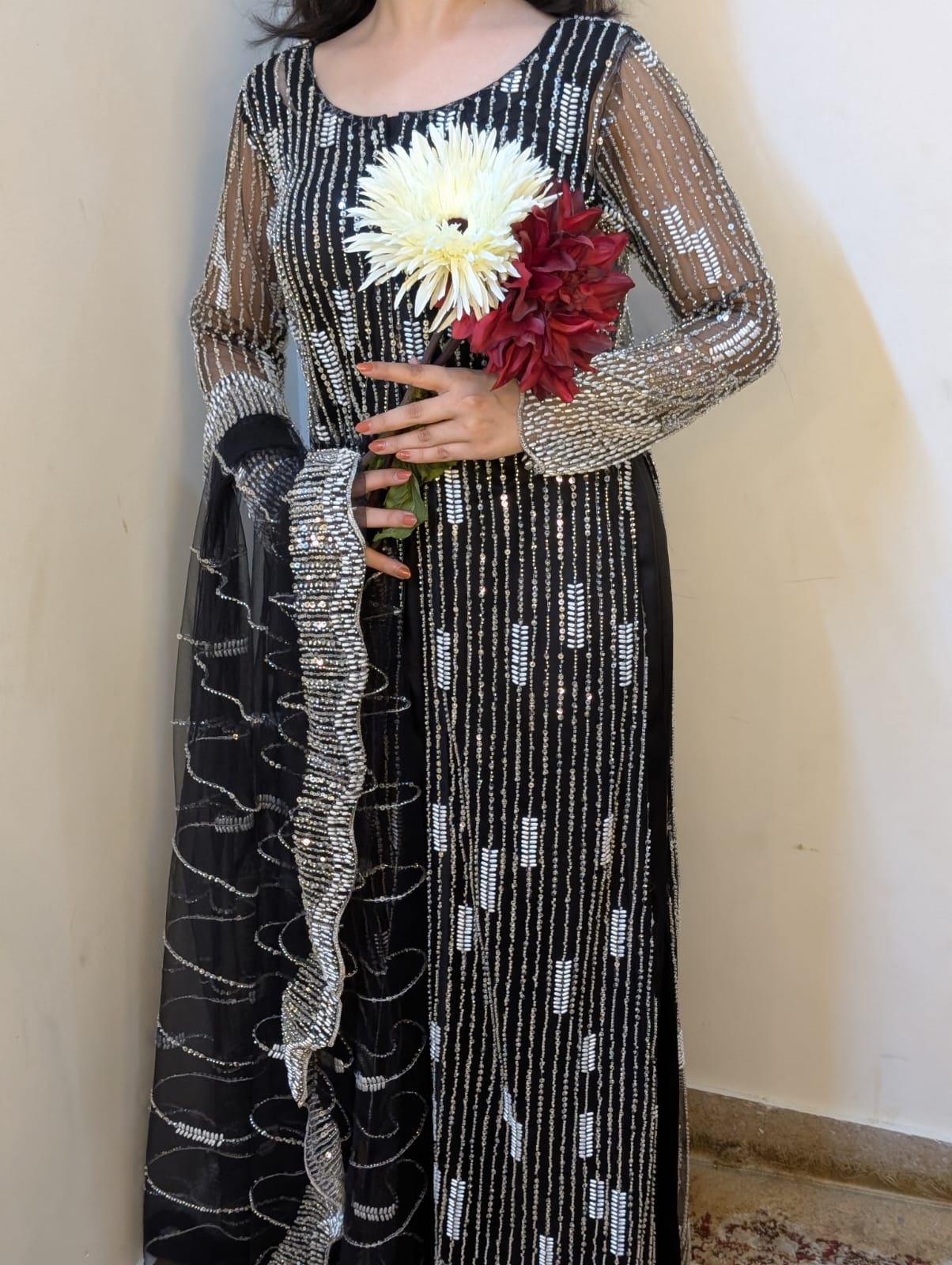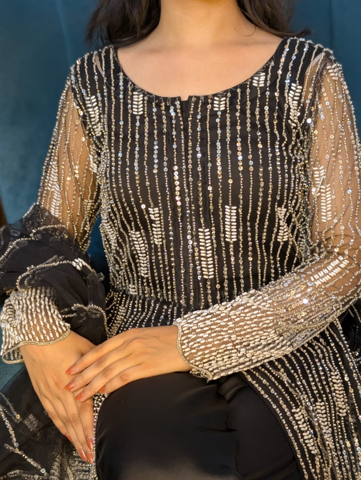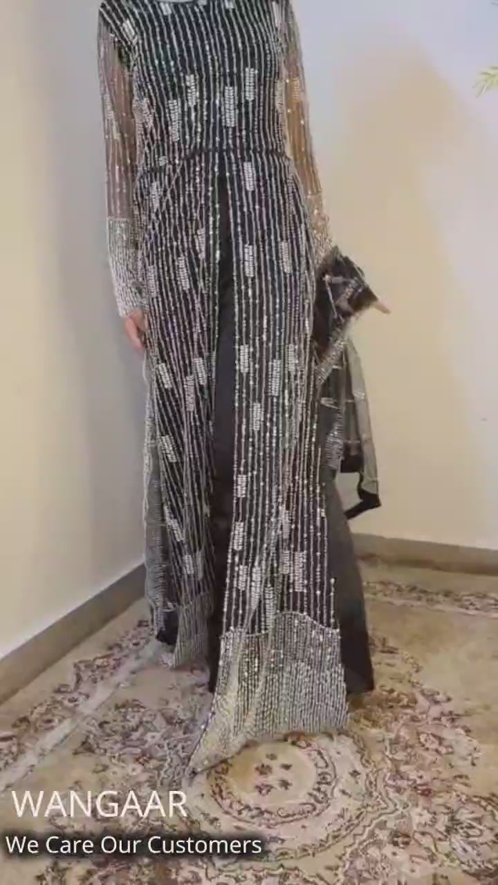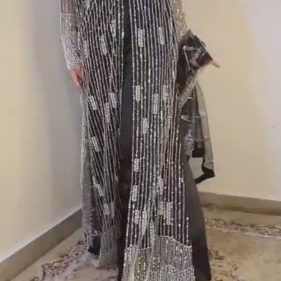 Elegant net 3 PC dress adorned with delicate pearls, MOTi, and cut Dana work. Perfect blend of grace and craftsmanship, ideal for festive and formal occasions.