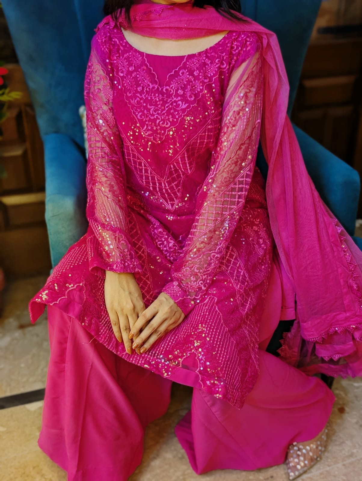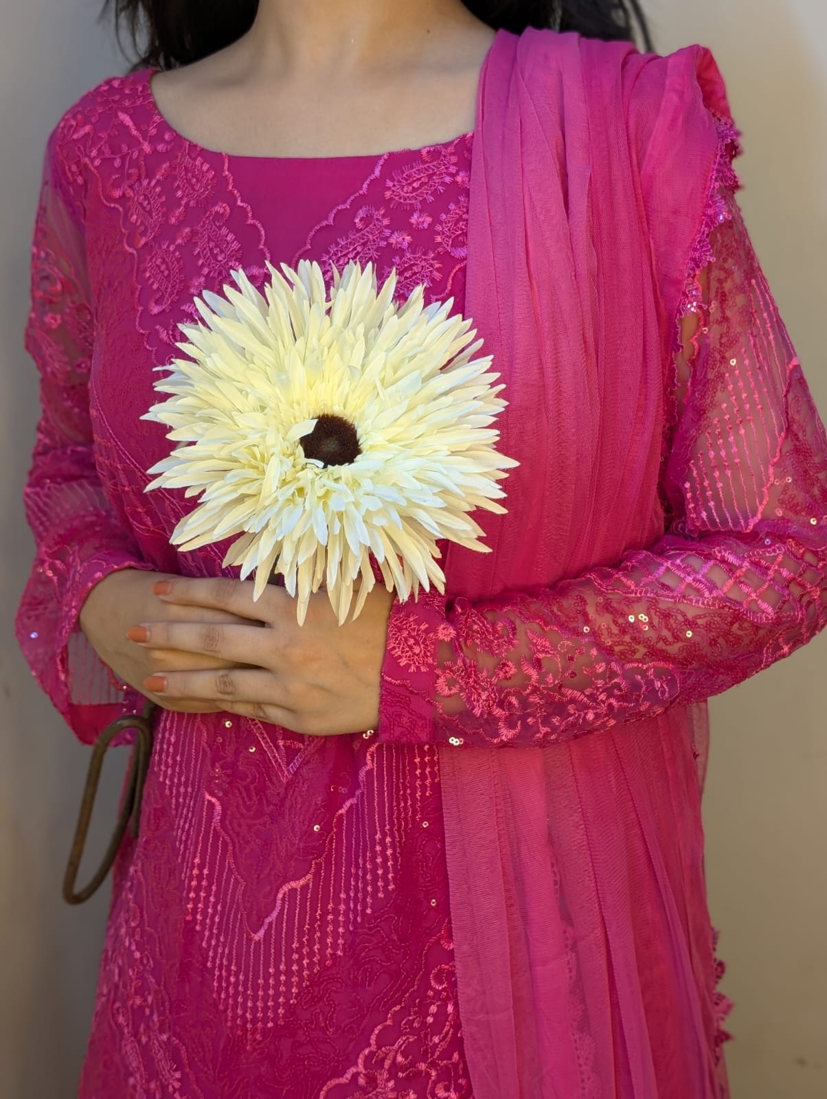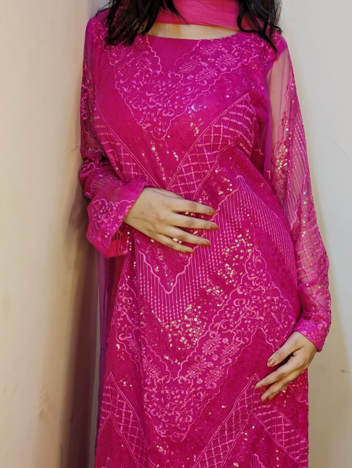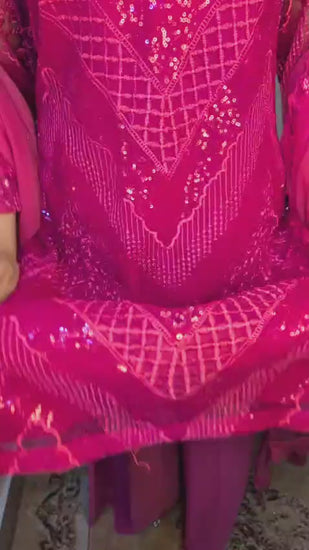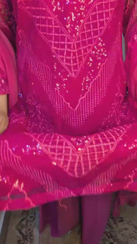 Pink net 3 PC dress beautifully embellished with sequins and intricate thread work, offering a graceful and elegant look perfect for festive and formal occasions.