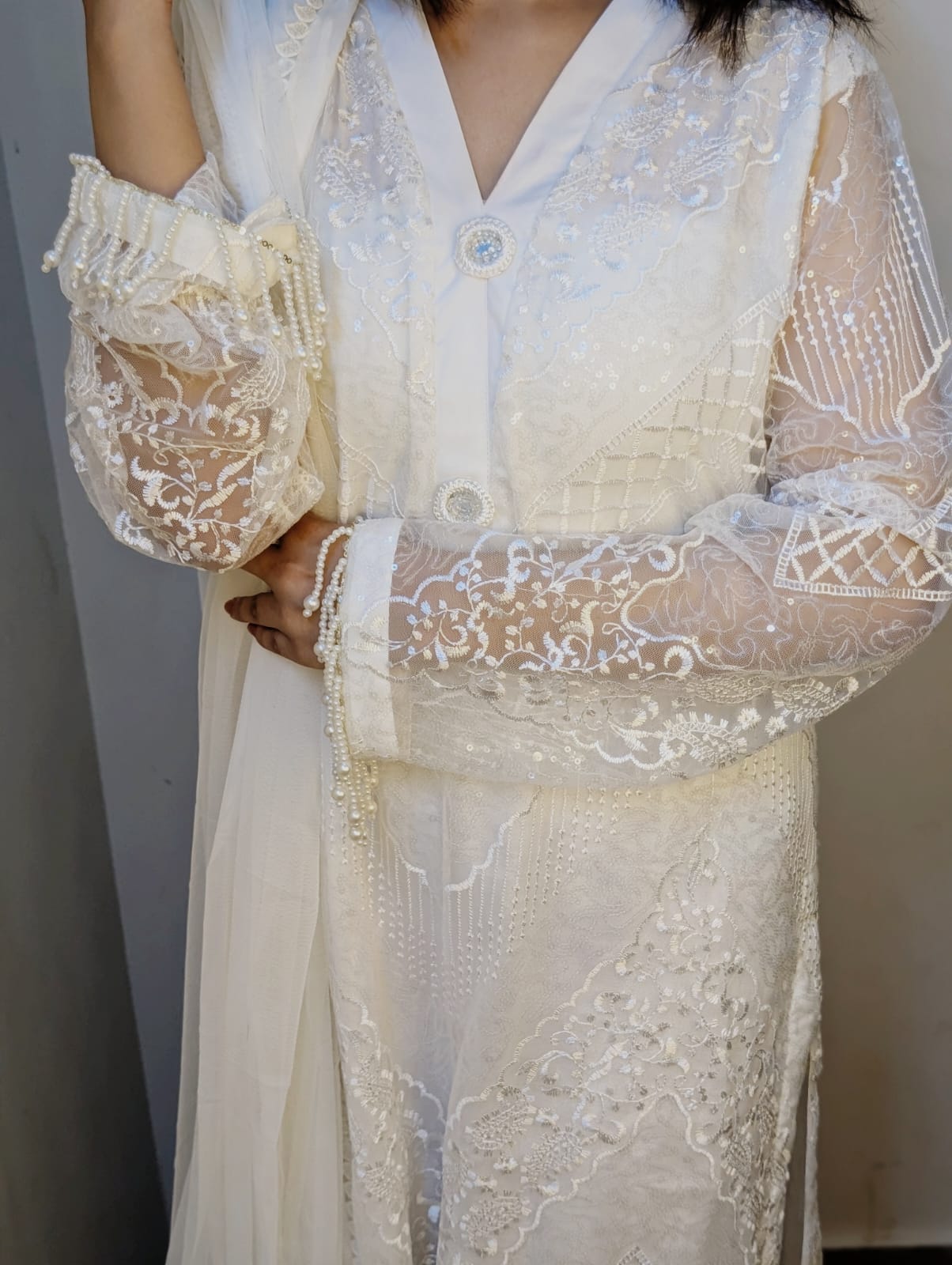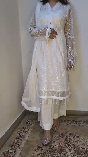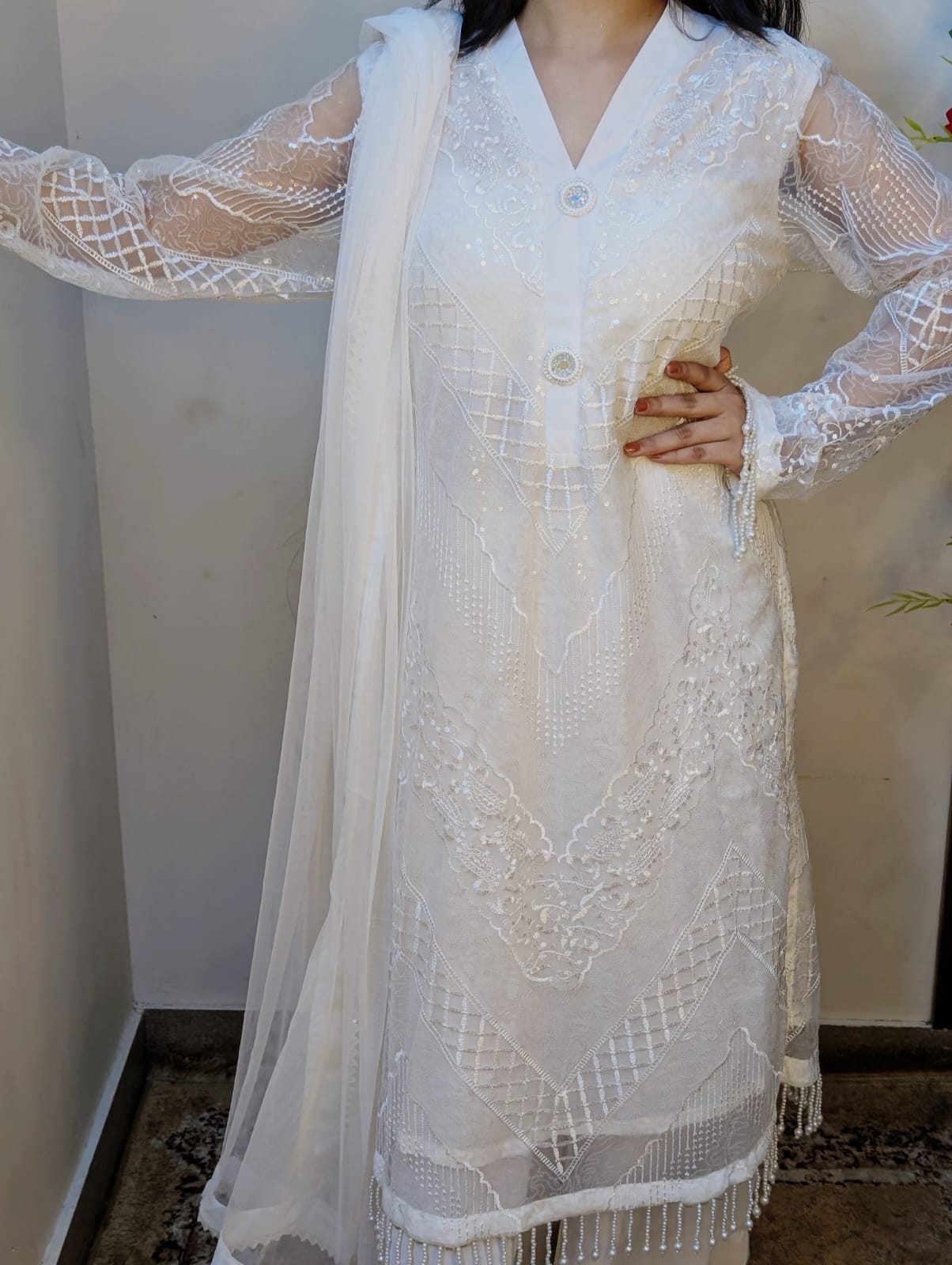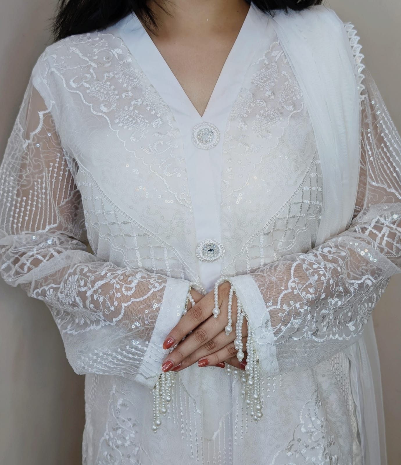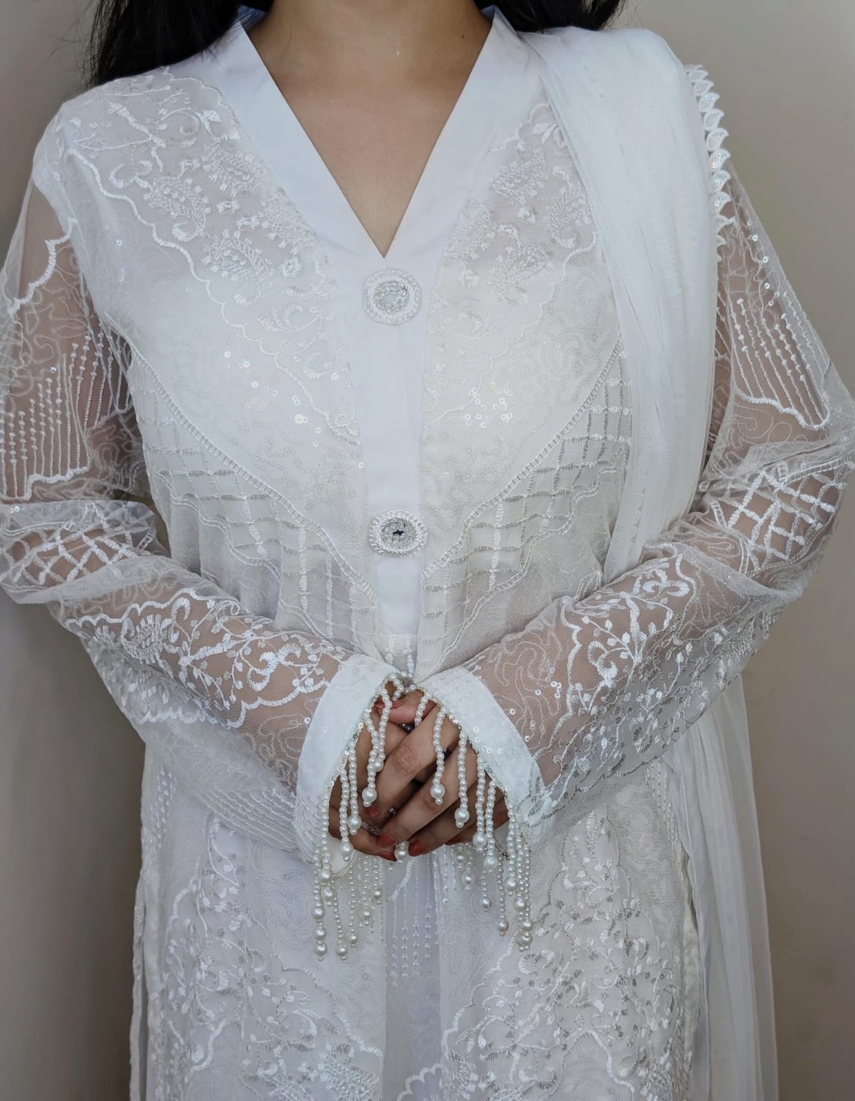 White net 3 PC dress beautifully embellished with sequins and intricate thread work, offering a graceful and elegant look perfect for festive and formal occasions.